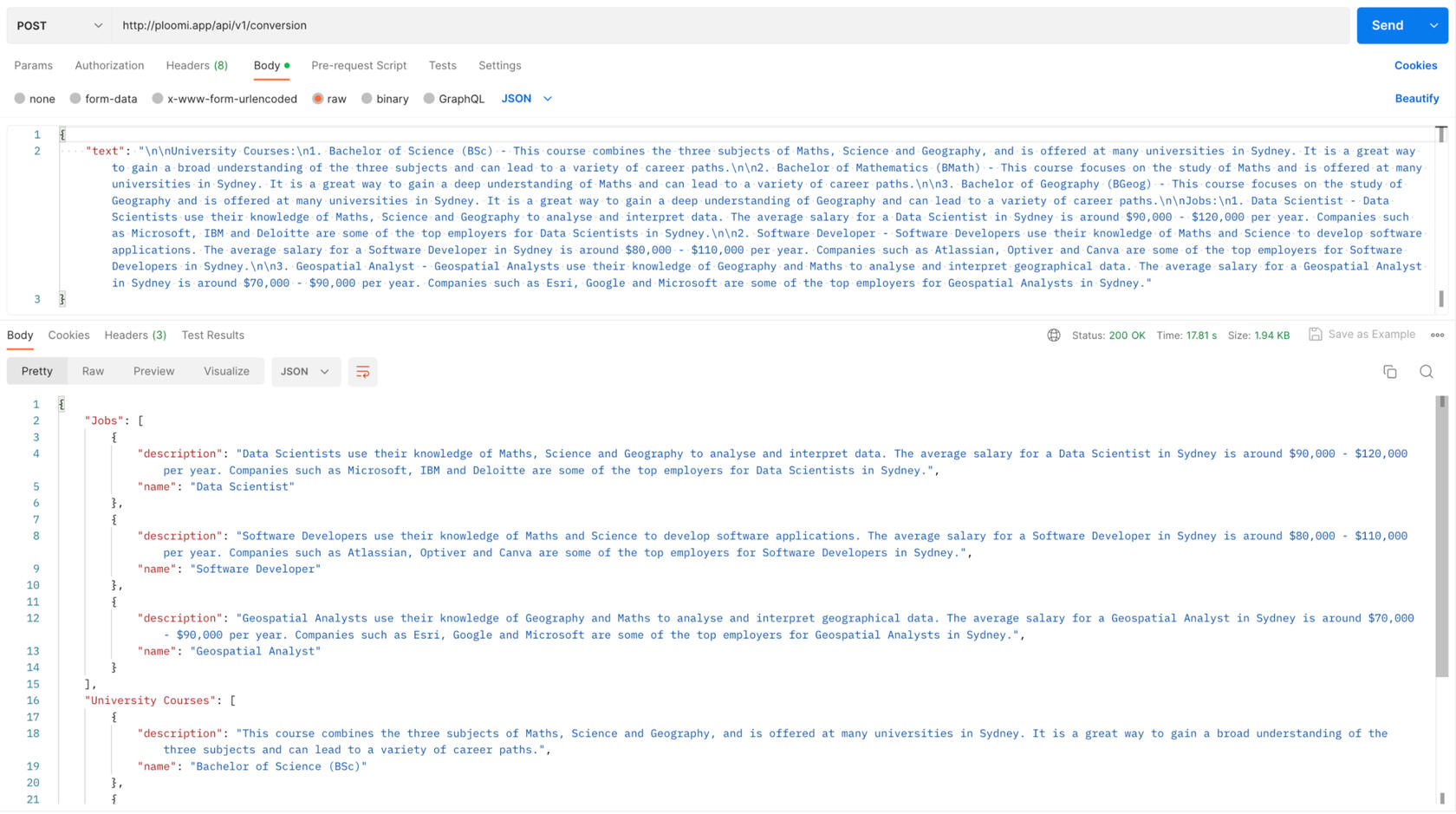 Now take that plain text and pass it through ploomi's API to intelligently identify structure in that text and return it in JSON format.